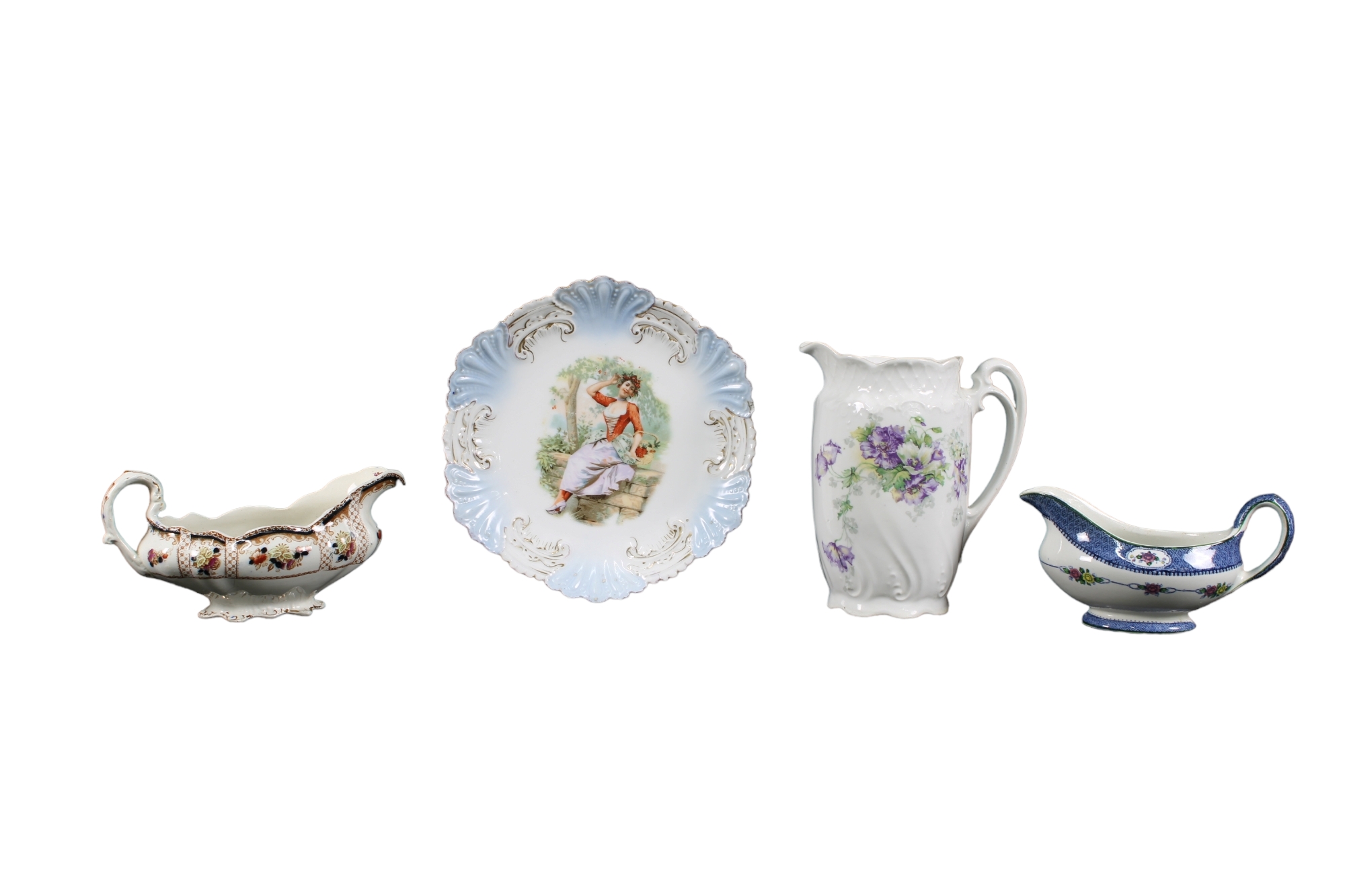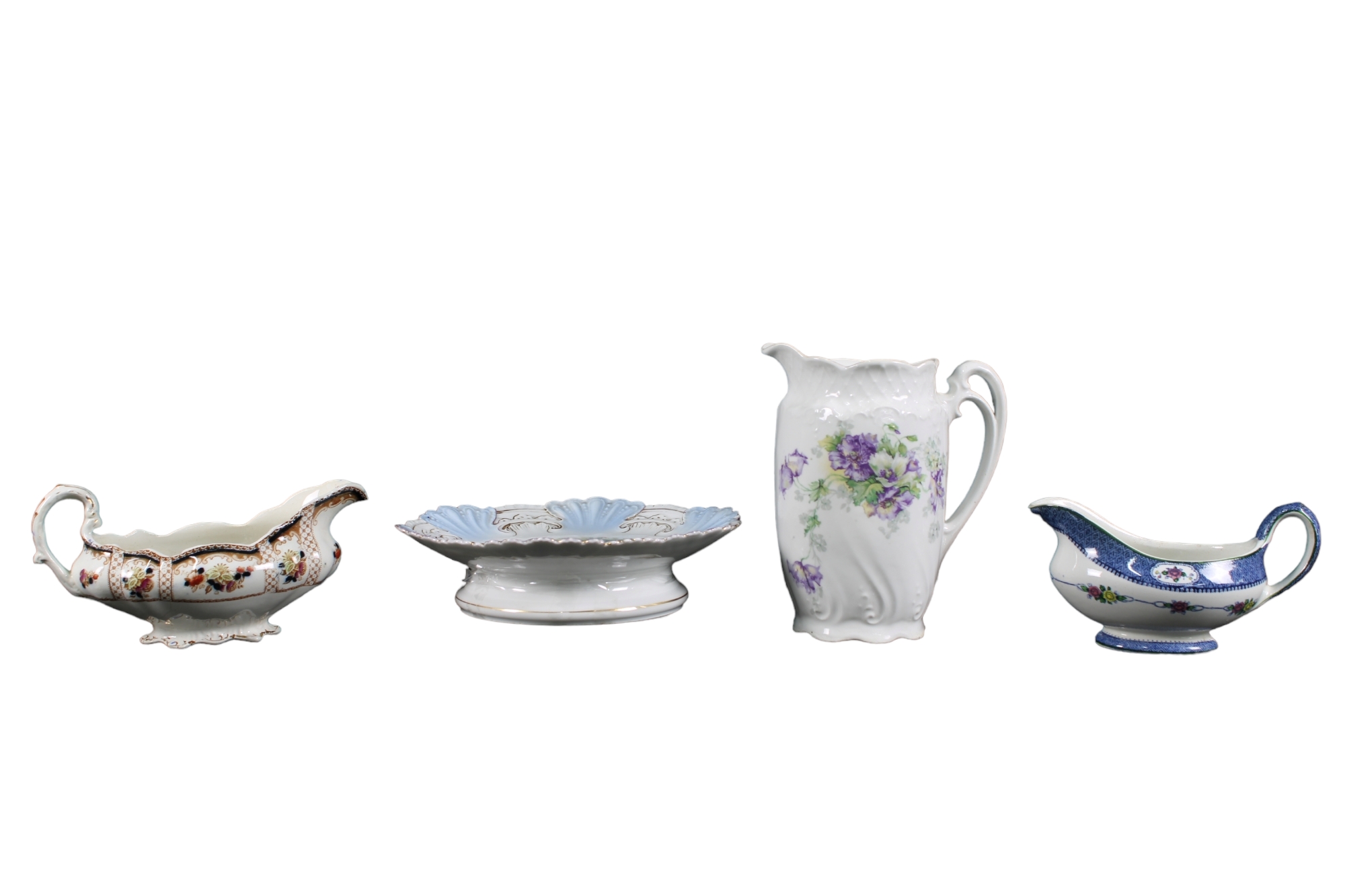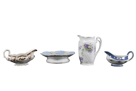 GRUPPO DI 4 OGGETTI VINTAGE in porcellana di cui: 2 salsiere, 1 brocca e 1 centrotavola misure varie