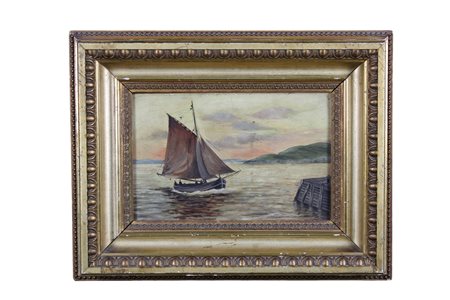 J.B. WILLS OLIO SU CARTONCINO soggetto marina con barca a vela XX secolo h cm 17 x 27 / cornice h cm 42 x 33