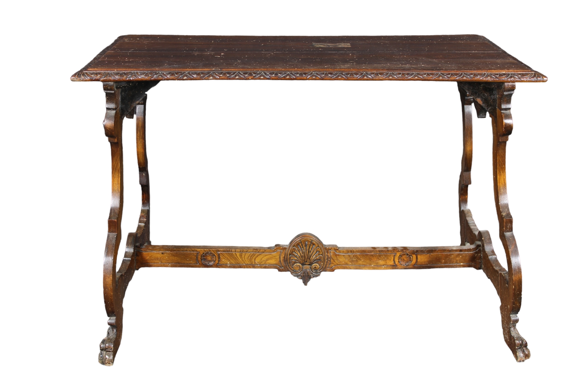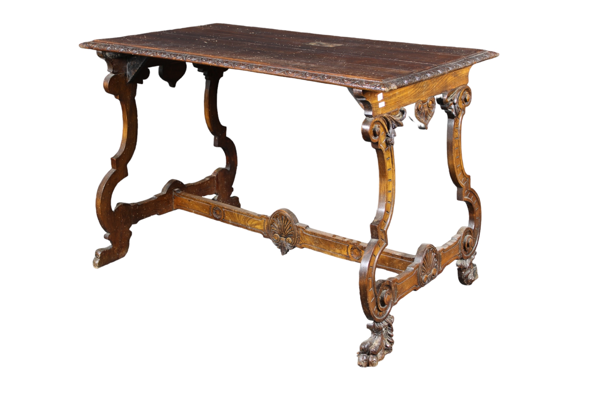TAVOLO SCRITTOIO DI FORMA FRATINA in legno di noce finemente scolpito a basso rilievo Sicilia XIX secolo h cm 79 x 119 x 69