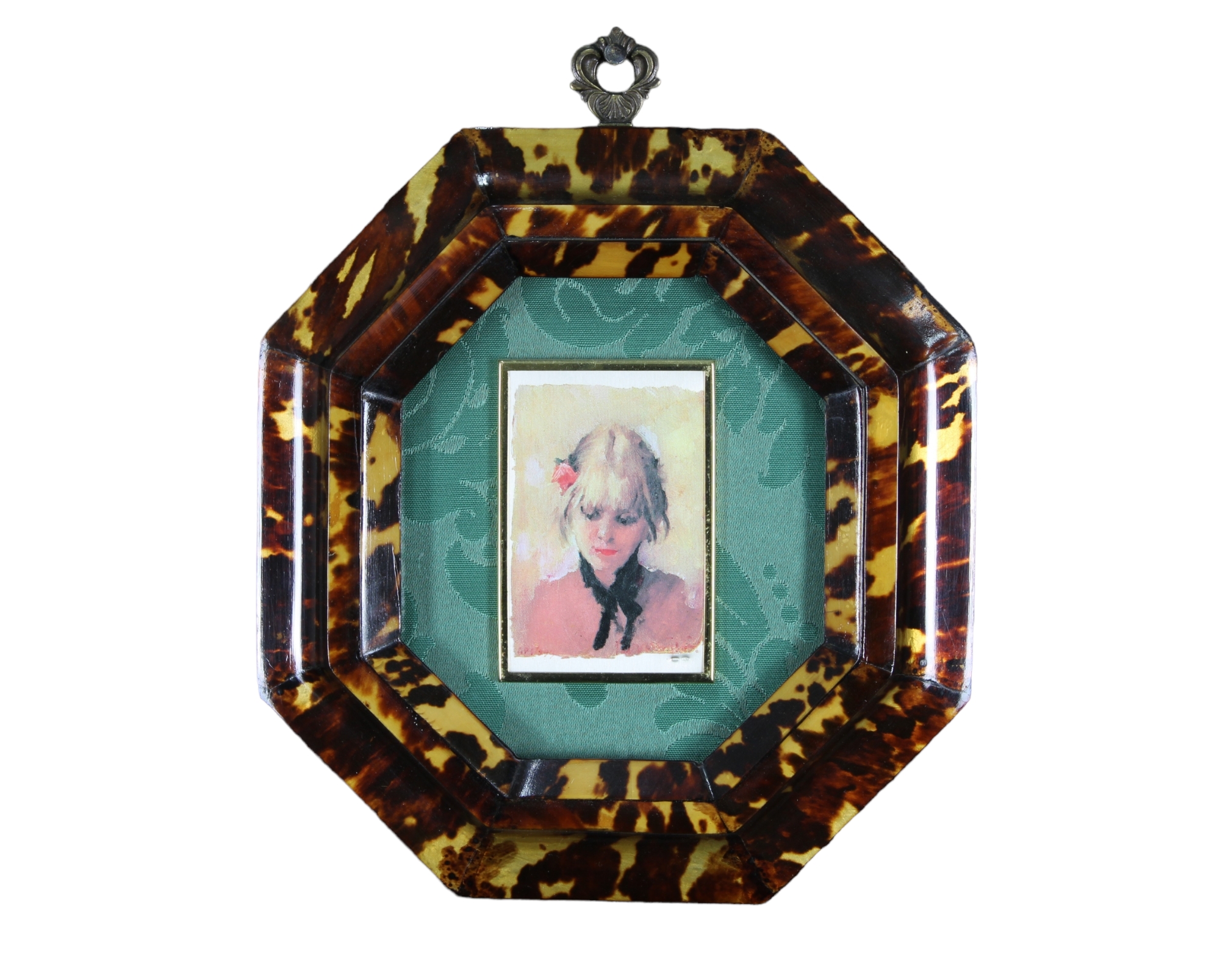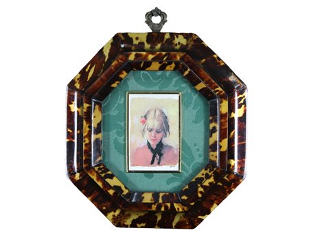 RITRATTO DI DONNA SU PLACCA in argento dentro teca in materiale pregiato XX secolo Italia h cm 9 x 6 / teca h cm 21 x 20