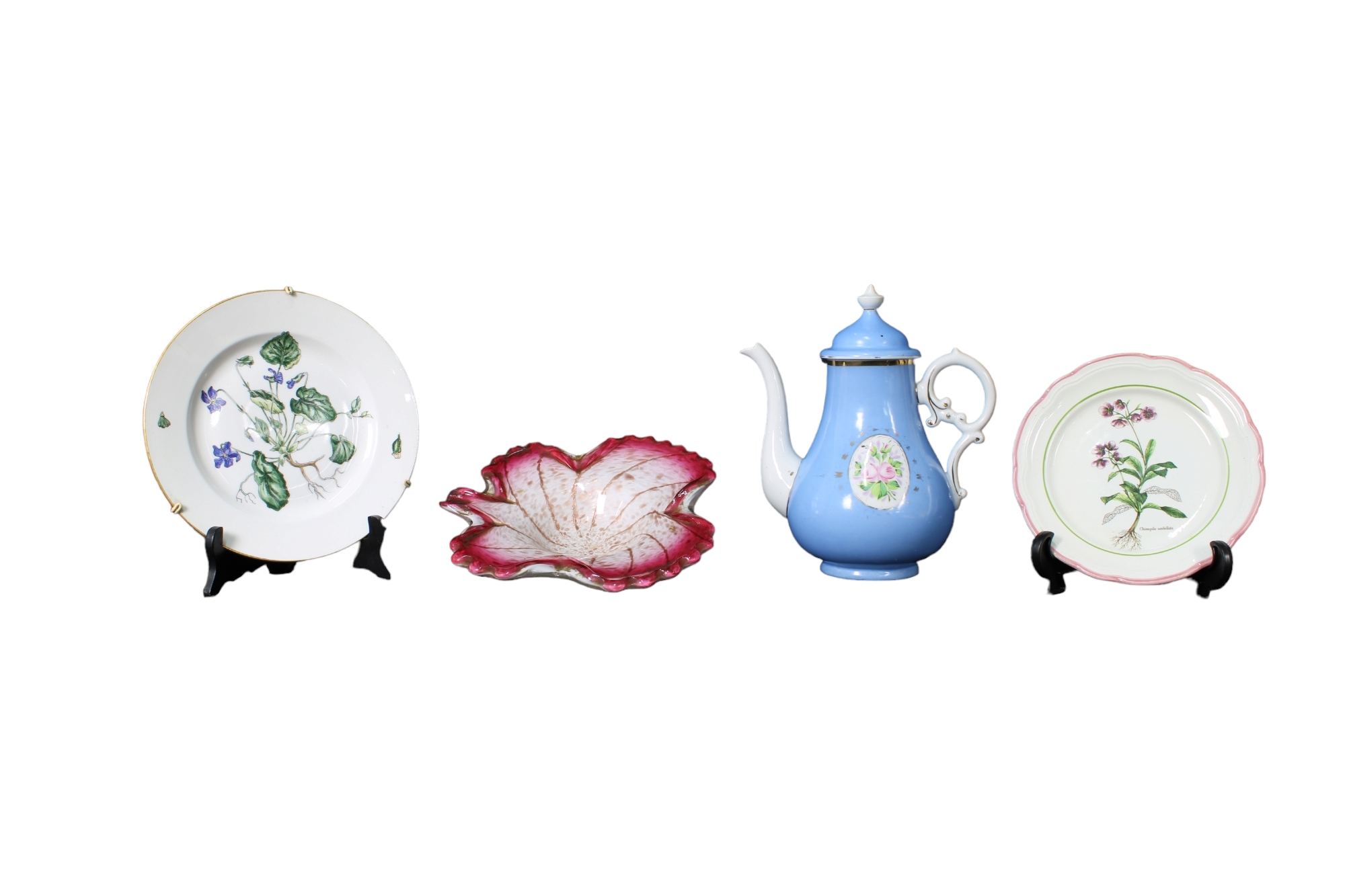 GRUPPO DI 4 OGGETTI VINTAGE in porcellana di cui: 2 piatti, 1 centrotavola e 1 caffettiera misure varie