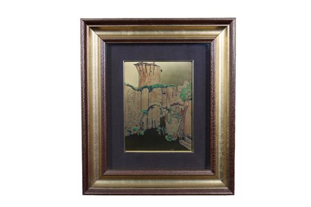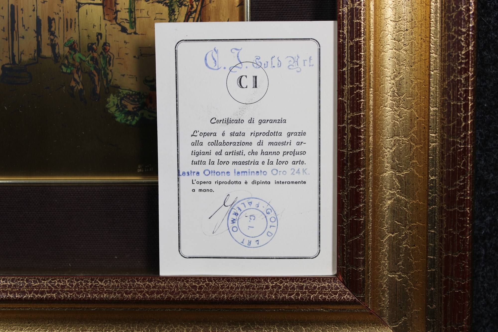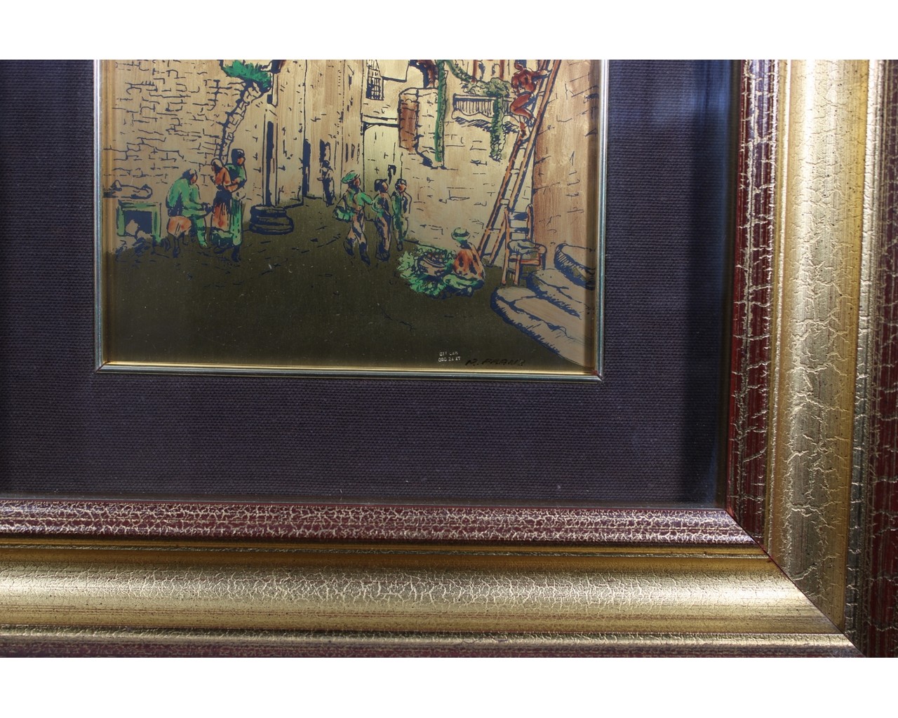 LASTRA AD OTTONE LAMINATO IN ORO Raffigurante scorcio di paese con personaggi firmato R.Franz XX secolo h cm 44,5 x 38,5