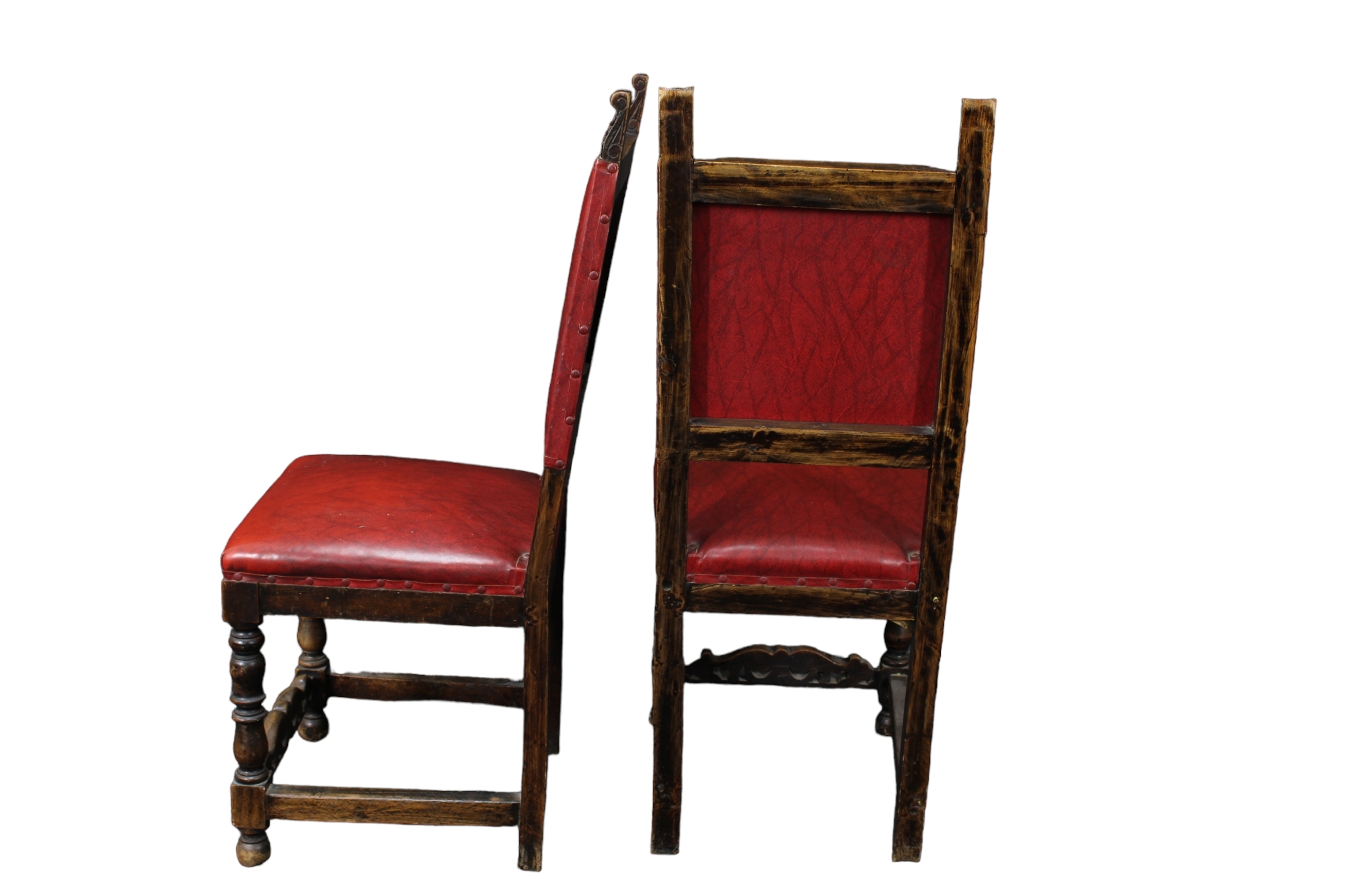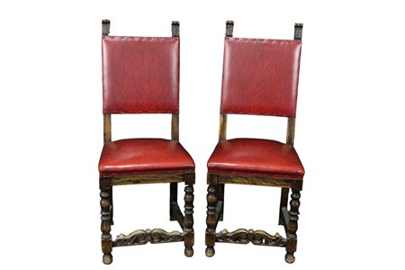 COPPIA SEDIE DI GUSTO RINASCIMENTALE in legno di noce, seduta e schienale in simil pelle Sicilia XIX secolo h cm 107 x 43 x 43