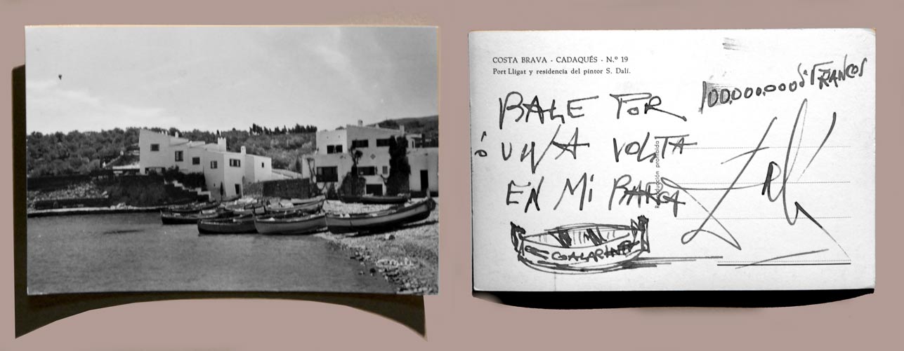 DALI' Salvador (Figueres 1904 - Figueres 1989) Senza titolo cartolina cm. 9 x 13.5 Scritta, firma 'Bale por 100.000.000 francos o una volta en mi barca, Dalì' (al retro)
