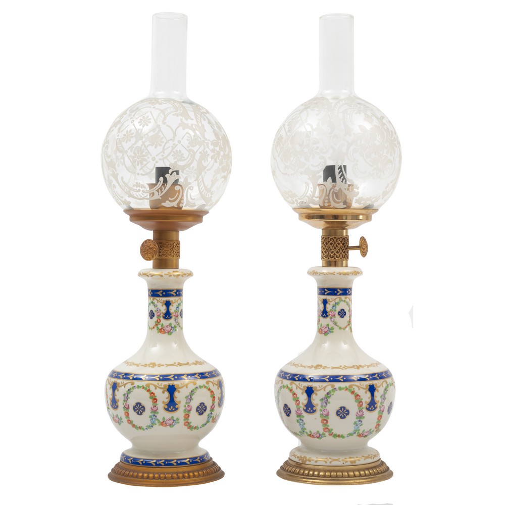 COPPIA LUMI in porcellana con base in metallo dorato e bocce in vetro.