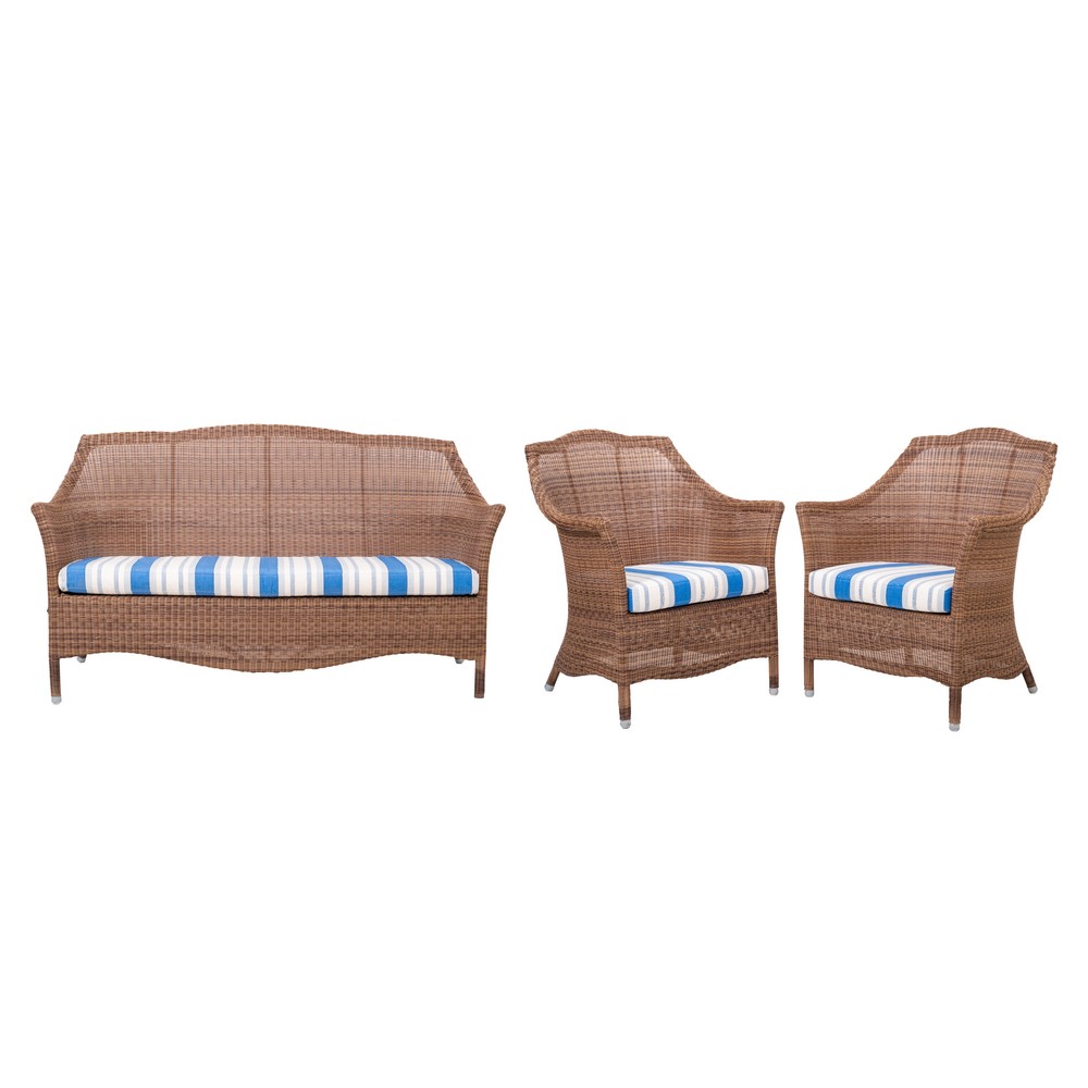 Salotto da esterno composto da divano e due poltrone in materiale plastico.