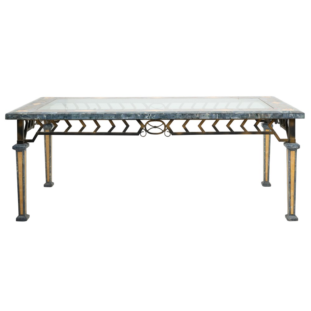 TAVOLO rettangolare in ferro con piano in vetro e lavorato con varie tipologie di marmo.
