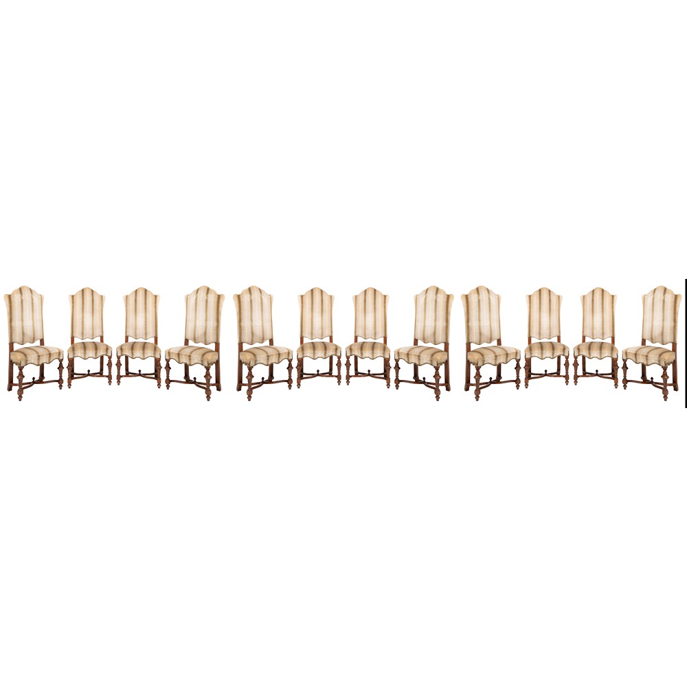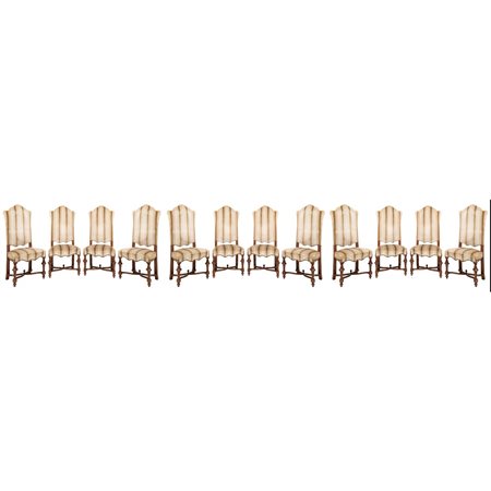 DODICI SEDIE in noce con piede a crociera, seduta e spalliere imbottite.