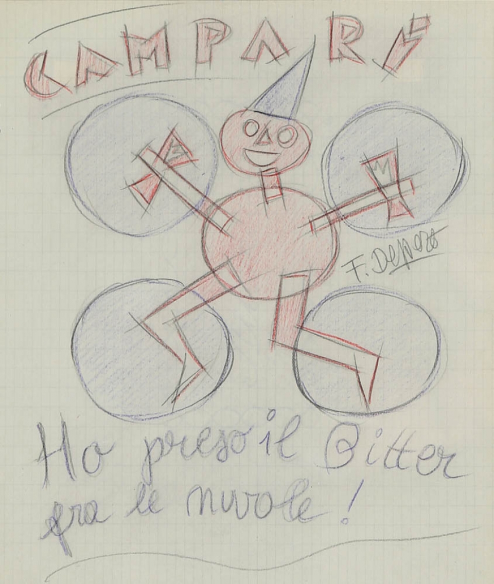FORTUNATO DEPERO 1892 - 1960 " Campari. Ho preso il bitter tra le nuvole ", 1929/30 Matite colorate su carta, cm. 25,7 x 21,8 Firmato Autentica Archivio Depero a cura di Maurizio Scudiero n. FD-3861-DIS Prov. Collezione Privata