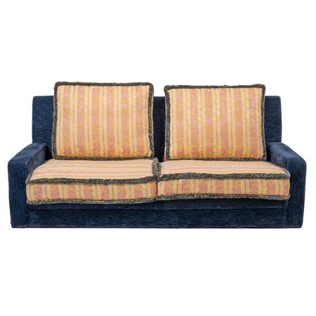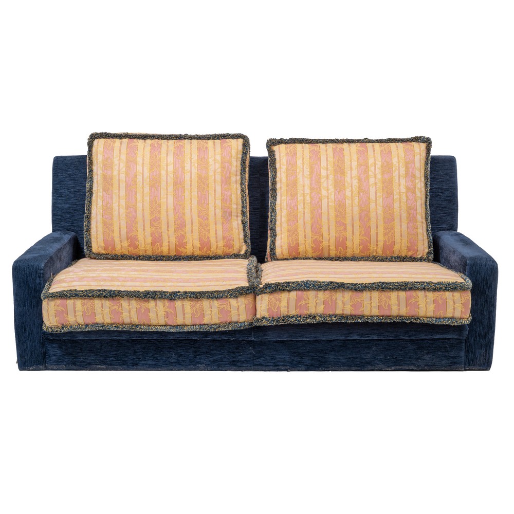 DIVANO a due posti rivestito in velluto con cuscini imbottiti e tappezzati.
