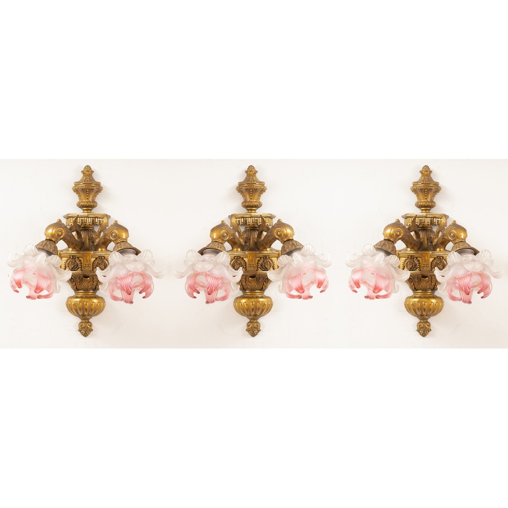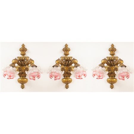 TRE APPLIQUE in bronzo dorato a due luci con bocce in vetro.