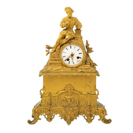 Orologio in bronzo dorato, doratura a mercurio con figura maschile.