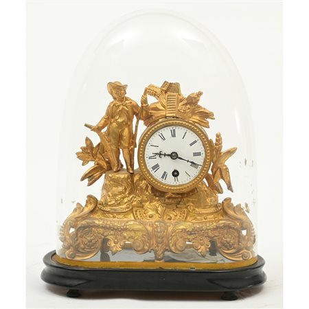 Orologio in metallo dorato con scultura raffigurante "Cacciatore", entro campana in vetro e base in legno ebanizzato.