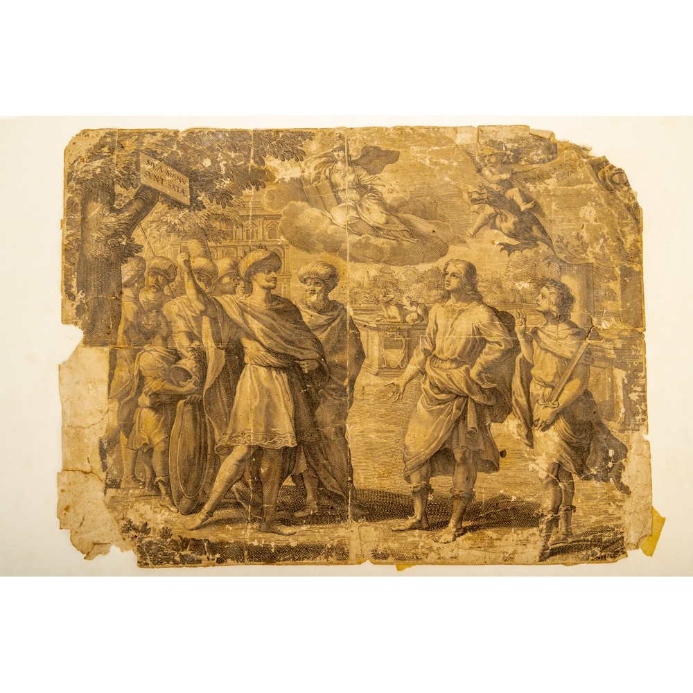 INCISIONE MEA MANU SUNT SATAE. Copia tardo settecentesca applicata su carta coeva. Cm 38 x 29. Con alcune perdite ai bordi. Necessita di restauro. Incontro di Ciro e Lisandro, ricavato dal famoso piatto pentacromato di Angelo Francesco Grue, considerato dai critici il suo capolavoro.