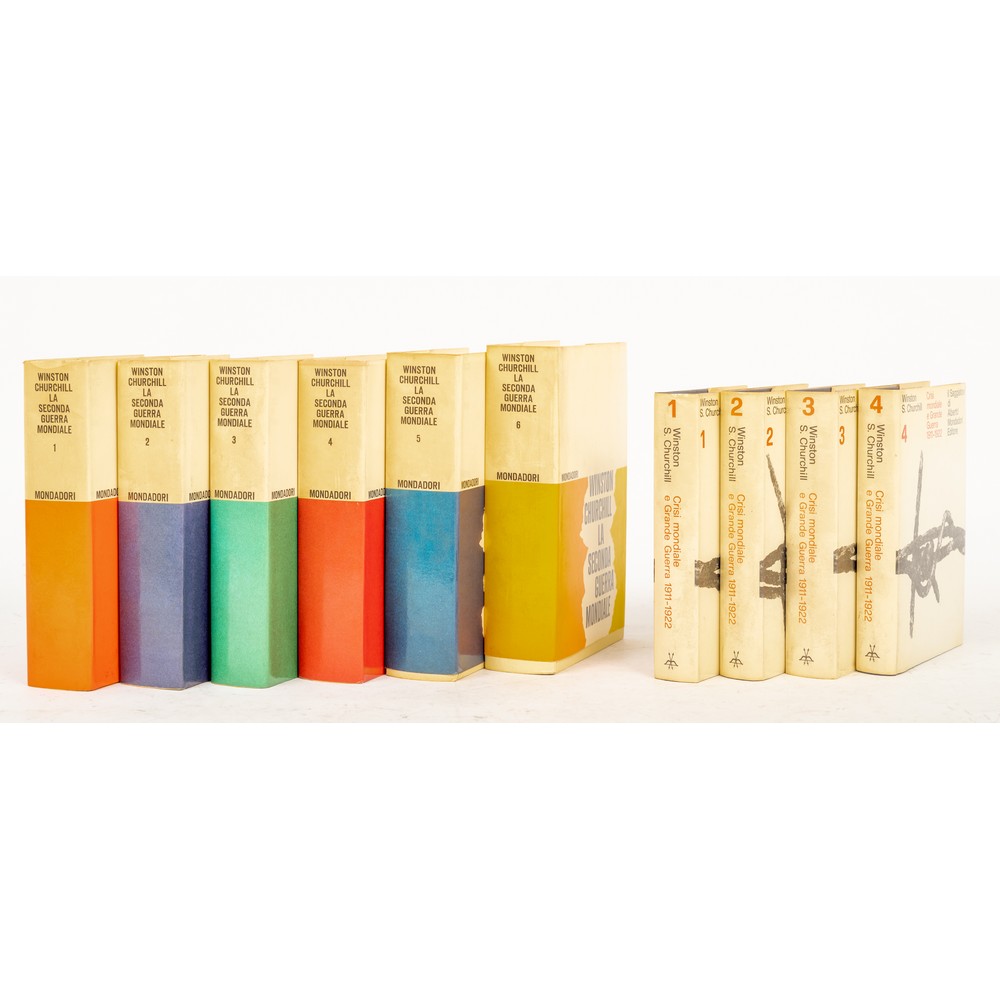 DIECI VOLUMI DI STORIA DI WINSTON CHURCHILL: 1) CRISI MONDIALE E GRANDE GUERRA 1911 – 1922, opera completa in 4 volumi, ed. Il Saggiatore 1968. 1^ edizione. Traduzione dall'inglese dell'Ammiraglio di Divisione Federico Castrace. Cm 21 x 16. Legatura editoriale in balacron rigido e sopraccoperta illustrata con ali. Pp. 532 ( 10); 553 (4): 609 (6); 468 (2). 2) LA SECONDA GUERRA MONDIALE, ed. Arnoldo Mondadori Editore 1971. X edizione. Opera completa in 6 volumi. Legatura editoriale rigida con sopraccoperta editoriale e tagli irregolari. Vol. 1: L’ADDENSARSI DELLA TEMPESTA (Con 88 illustrazioni fuori testo e 13 cartine, pp. 835)Vol. 2: LA LORO ORA PIU BELLA (Con 64 illustrazioni fuori testo e 20 cartine e diagrammi, pp. 735)Vol. 3: LA GRANDE ALLEANZA (Con 64 illustrazioni fuori testo e 28 cartine, pag. 967)Vol. 4: LA SVOLTA FATALE (Con 66 illustrazioni fuori testo e 37 cartine, foto e diagrammi, pp. 1177)Vol. 5: LA MORSA SI STRINGE (Con 64 illustrazioni fuori testo e 21 cartine, diagrammi e fotografie, pp. 783)Vol. 6: TRIONFO E TRAGEDIA (Con 64 illustrazioni fuori testo e 24 cartine e diagrammi, pp. 870). Volumi in ottimo stato di conservazione, con pagine fresche e pulite.