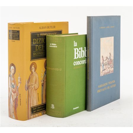 TRE VOLUMI DI ARGOMENTO RELIGIOSO: 1) AA. VV. LA BIBBIA CONCORDATA, ed. Mondadori 1969. In perfette condizioni. Legatura in piena tela rigida verde con titoli e fregi al piatto e al dorso. Cm 25 x 18. Segnapagine in stoffa. Pp. 2090 con tavole e cartine a colori f. t. 2) F. Conigliaro / A. Lipari / C. Scordato NARRAZIONE TEOLOGICA SPIRITUALITA’ DEL NATALE, ed. Palermo 1987. Cm 31 x 22. Legatura in tela con titoli impressi in oro e fotoapplicazione al piatto. Pp. 116. 3) Alban Butler IL PRIMO GRANDE DIZIONARIO DEI SANTI SECONDO IL CALENDARIO, ed. Piemme 2001. 1^ edizione. Legatura editoriale in Balacron rigido con sopraccoperta illustrata. Pp. 1338.