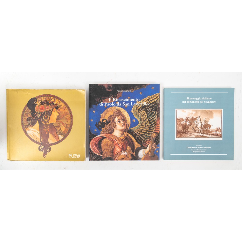 TRE VOLUMI D’ARTE: 1) AA. VV. IL RINASCIMENTO DI PAOLO DA SAN LEOCADIO, ed. Kalos 2009. Cm 24 x 22. Brossura editoriale illustrata con ali. Pp. 247 (1). 2) Christiane Garnero Morena – a cura di - IL PAESAGGIO SICILIANO NEI DOCUMENTI DEI VOYAGEURS, ed. Grifo 1997. Cm 23 x 22. Catalogo della mostra iconografica tenutasi all’Orto Botanico in occasione della XIX Universiade estiva. Brossura editoriale illustrata con ali. Pp. 123. 3) AA. VV. ALFONS MUCHA 1860 - 1939, ed. Mathildenhohe Darmstadt 1980. Catalogo della esposizione tenutasi alla Mathildenhohe tra Giugno e Agosto 1980. Cm 22 x 24. Brossura editoriale illustrata. Pp. 419.