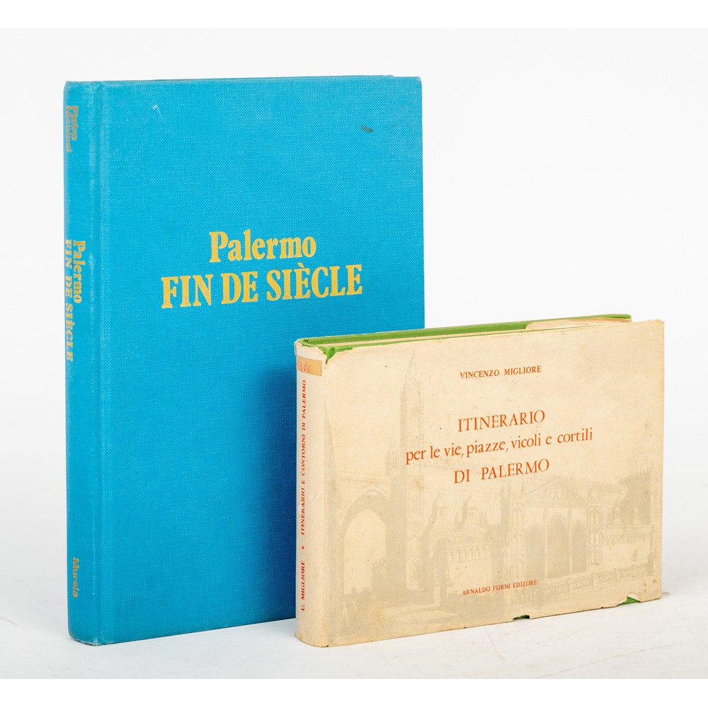 DUE VOLUMI SU PALERMO: 1) Pietro Nicolosi PALERMO FIN DE SIECLE, ed. Mursia 1979. Prima edizione, collana Città Fatti e figure. Legatura editoriale in tela con titoli impressi in oro al piatto e al dorso. Cm 24 x 17. Pp. 160, illustrato con figure in nero e colori nel testo e fuori testo. In ottime condizioni. 2) Vincenzo Migliore ITINERARIO PER LE VIE, PIAZZE, VICOLI E CORTILI DI PALERMO, ed. Arnaldo Forni Editore 1978, ma riproduzione anastatica dell’edizione del 1656. In formato 16° orizzontale. Legatura editoriale e sopraccoperta editoriale illustrata in carta. Leggere fioriture sparse ma nel complesso in ottime condizioni. Pp. CLXXXVIII (6).