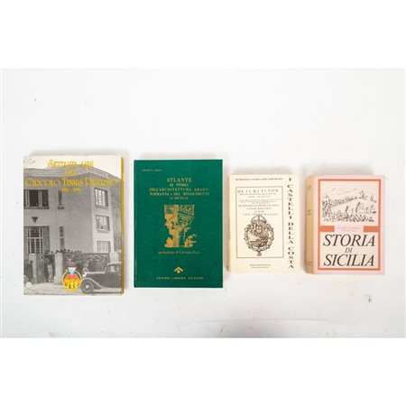 QUATTRO VOLUMI DI VARIA SULLA SICILIA: 1) Luigi Natoli (William Galt) STORIA DI SICILIA, ed. S. F. Flaccovio, Palermo 1982. Brossura editoriale con sopraccoperta in carta illustrata. Cm 24 x 17. II edizione a cura e con nota introduttiva di Massimo Ganci. Pp. 375. In ottime condizioni. 2) Petronilla Maria Adelaide Russo I CASTELLI DELLA COSTA, ed. Publisicula, 2002. Brossura editoriale figurata con mezze ali. Cm 24 x 17. Pp. 287. In perfette condizioni. 3) Giulio Ulisse Arata ATLANTE DI STORIA DELL’ARCHITETTURA ARABO NORMANNA E DEL RINASCIMENTO IN SICILIA, Edizioni Librarie Siciliane, Palermo s. d. ma ristampa anastatica dell’edizione del 1925. Prefazione di Corrado Ricci. Legatura editoriale in balacron finta tela con titoli e disegni dorati al piatto e titoli dorati al dorso. Cm 32 x 22. Pp. 160 e CXX tavole. 4) AA. VV. SETTANTA ANNI DEL CIRCOLO TENNIS PALERMO 1926 – 1996, ed. Palermo, Giornale di Sicilia 1996. Copia n. 207. Cm 35 x 25. Legatura editoriale in tela beige con impressione del logo in oro al piatto e titoli in oro al dorso. Sopraccoperta editoriale illustrata. Pp. 156.