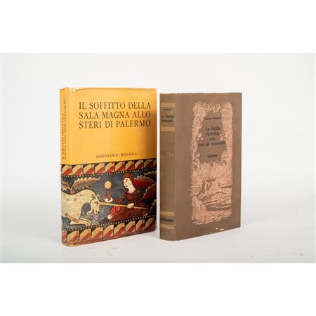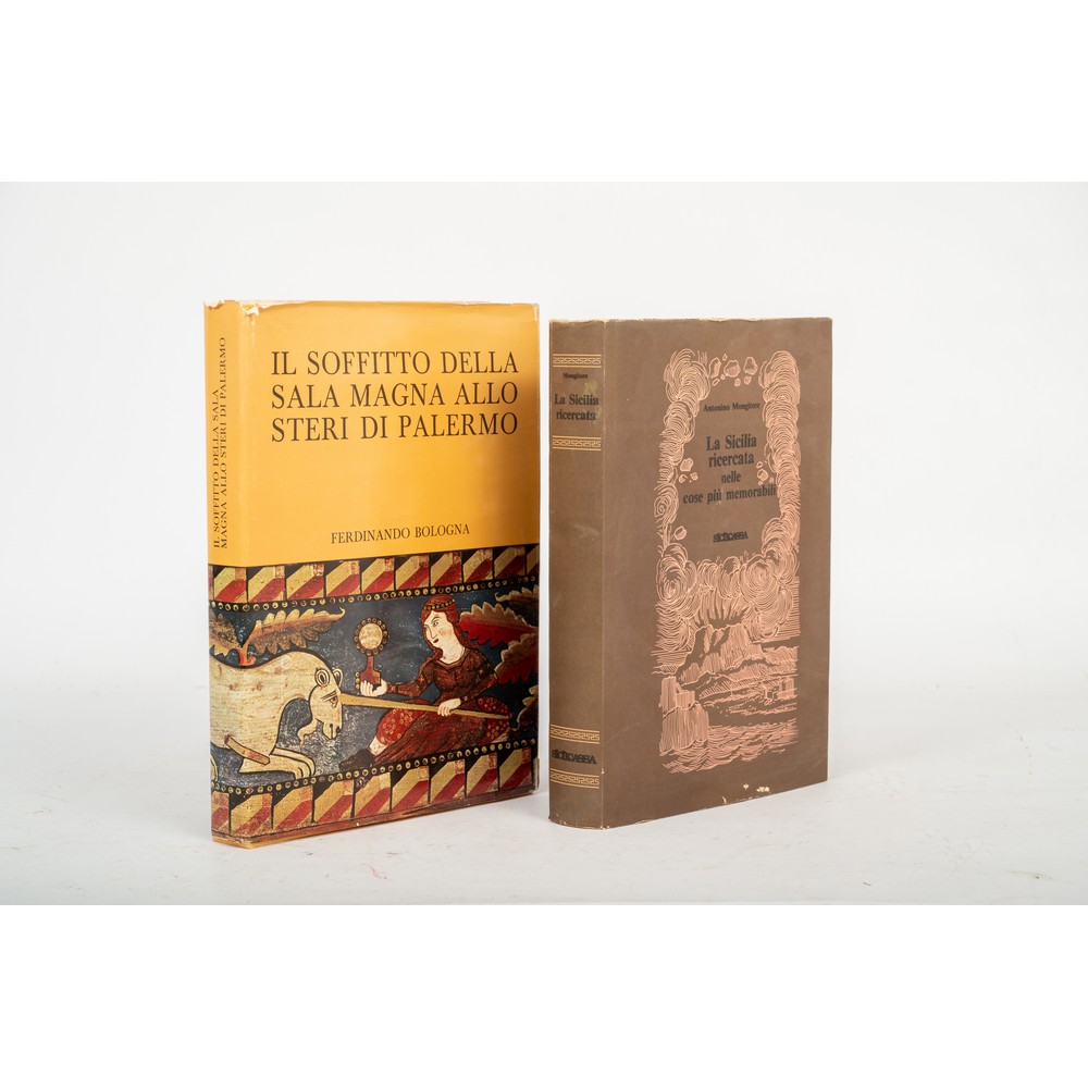 DUE VOLUMI D’ARTE SULLA SICILIA: 1) Ferdinando Bologna IL SOFFITTO DELLA SALA MAGNA ALLO STERI DI PALERMO, ed. S. F. Flaccovio 1975. Legatura editoriale con titoli impressi in oro al piatto e al dorso. Sopraccoperta editoriale illustrata. Cm 33 x 25. Pp. 342 con un ricco apparato di tavole f. t.2) Antonino Mongitore LA SICILIA RICERCATA NELLE COSE PIU’ MEMORABILI, ed. Cassa Centrale di Risparmio V. E., 1981 ma ristampa anastatica dell’opera del 1742. Legatura editoriale in balacron con titoli impressi in oro al piatto e al dorso. Sopraccoperta editoriale in carta illustrata. Prefazione di Massimo Ganci. Introduzione di M. Emma Alaimo. Illustrazioni di Renato Guttuso. Cm 32 x 22. Pp. XXXVII, 271 e con un ricco apparato di tavole.