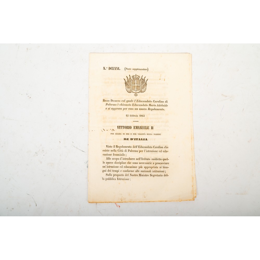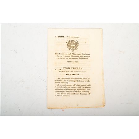 REGIO DECRETO col quale l’Educandato Carolino di Palermo è chiamato Educandato Maria Adelaide e si approva il nuovo Regolamento. Il documento a stampa è datato 12 Febbraio 1863. Le pagine sono ancora intonse. Il documento, in 8°, in perfette condizioni consta di 20 pagine legate con cucitura originale. Raro a trovarsi.