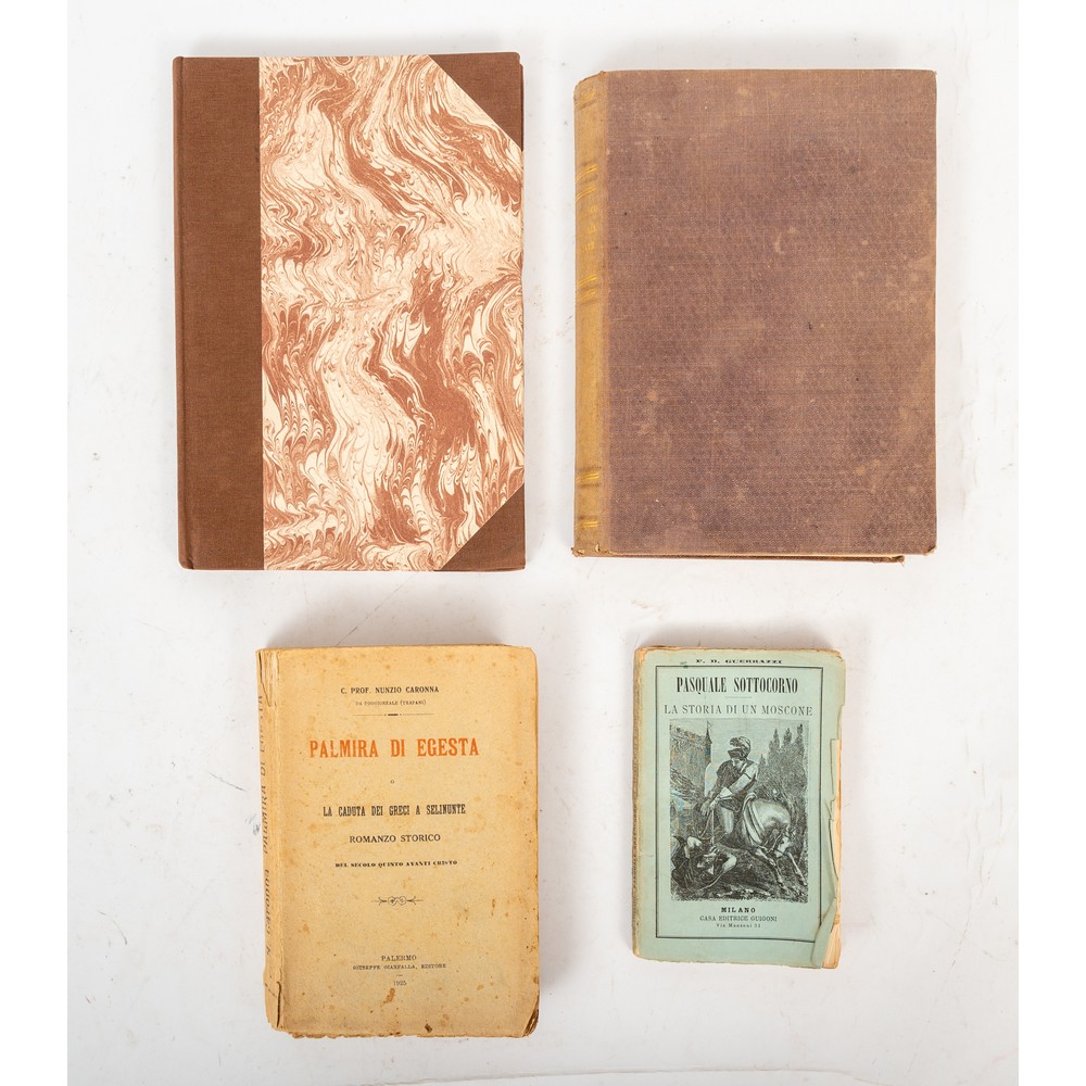 QUATTRO ROMANZI STORICI DEL XIX E XX SECOLO: 1) Walter Scott STORIA DELLE CROCIATE, OVVERO RICCARDO CUOR DI LEONE, ed. Milano, Simonetti 1870. In 8°. In ottime condizioni. Pp. 430, II. 2) F. D. Guerrazzi PASQUALE SOTTOCORNO e STORIA DI UN MOSCONE, ed. Milano, Guigoni 1881. In 16°. Brossura editoriale illustrata. Tagli in barbe. All’antiporta incisione di Pasquale Sottocorno, eroe delle cinque giornate di Milano, e qui esaltato dal Guerrazzi. Segue il romanzo La storia di un Moscone, a forte sfondo patriottico e insurrezionale. Il volumetto si presenta in buone condizioni. Pp. 198. 3) Nunzio Caronna PALMIRA DI EGESTA O LA CADUTA DEI GRECI A SELINUNTE, ed. Palermo, Giuseppe Gianfalla Editore 1925. In 8° piccolo. Brossura editoriale e tagli in barbe. Rarissimo. Pp. 526 con numerose tavole f. t. Raro a trovarsi. 4) Antonio Prevost STORIA DI MANON LESCAUT, ed. Milano, Carlo Aliprandi s.d. ( ma 1900 circa). In 8°. Rilegatura successiva che contiene la brossura editoriale originale. Alcune pagine restaurate. Pp. 171.