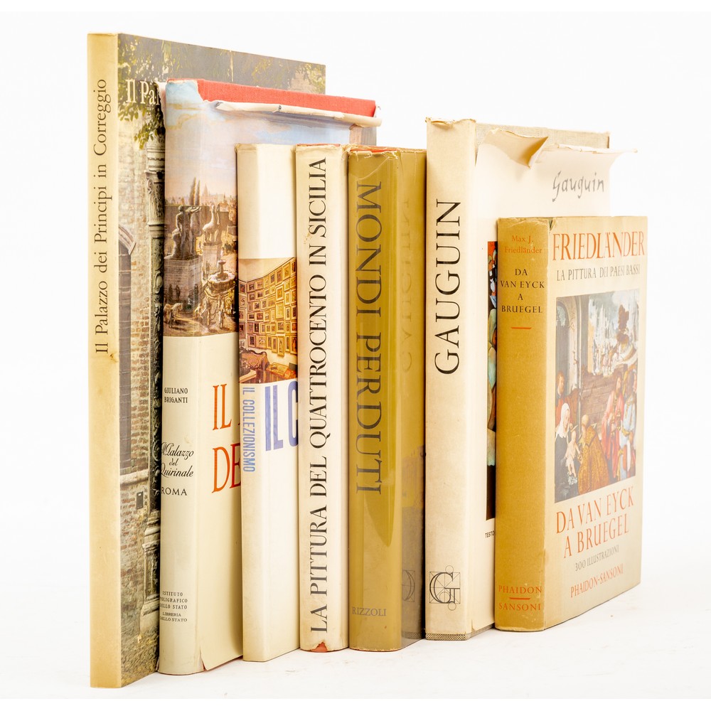 SETTE VOLUMI D’ARTE VARIA: 1) Robert Goldwater PAUL GAUGUIN, ed. Garzanti 1969. Cm 33 x 26. Con una bella fotoapplicazione in antiporta. Legatura editoriale in tela con titoli impressi in oro e sopraccoperta editoriale illustrata. Strappetti alla sopraccoperta. Pp. 158 con fotoapplicazioni a colori f. t. a tutta pagina.2) Marshall B. Davidson / Leonard Cottrel MONDI PERDUTI, ed. Rizzoli 1962. Cm 31 x 24. Legatura editoriale in tela con titoli impressi in oro e sopraccoperta editoriale illustrata con ali e acetato protettivo. Pp. 429 con un ricco apparato di immagini a piena e a doppia pagina.3) Max J. Friedland DA VAN EYCK A BRUEGEL, ed. Sansoni, Firenze 1956. Cm 27 x 20. Legatura editoriale in tela con titoli impressi in oro al tassello al dorso e sopraccoperta editoriale illustrata con ali in carta. Pp. 431 con un ricco apparato di immagini a piena pagina.4) Maria Miniati / Miranda Scagliotti IL COLLEZIONISMO, ed. Rizzoli 1969. Cm 32 x 24. Legatura editoriale in tela con titoli e fregi in oro e sopraccoperta editoriale illustrata con ali. Pp. 151 con un ricco apparato di immagini a piena pagina.5) AA. VV. IL PALAZZO DEI PRINCIPI IN CORREGGIO, ed. C.C.R.V.E. s. d. (ma 1980). Cm 38 x 29. Legatura editoriale in tela e sopraccoperta editoriale illustrata con ali. Pp. 113 con un ricco apparato di immagini a piena pagina.6) Stefano Bottari LA PITTURA DEL QUATTROCENTO IN SICILIA, ed. G. D’Anna 1954. Cm 32 x 23. Bella legatura editoriale in tela con titoli impressi in oro e sopraccoperta editoriale illustrata con ali. Strappetti alla sopraccoperta. Pp. 97 con CLXI tavole a piena pagina. 7) Giuliano Briganti IL PALAZZO DEL QUIRINALE, ed. Istituto Poligrafico dello Stato 1962. Cm 35 x 26. Legatura editoriale in tela con titoli impressi in oro e sopraccoperta editoriale illustrata con ali. Strappetti e usure alla sopraccoperta. Pp. 91 di testo con 132 tavole a piena pagina.