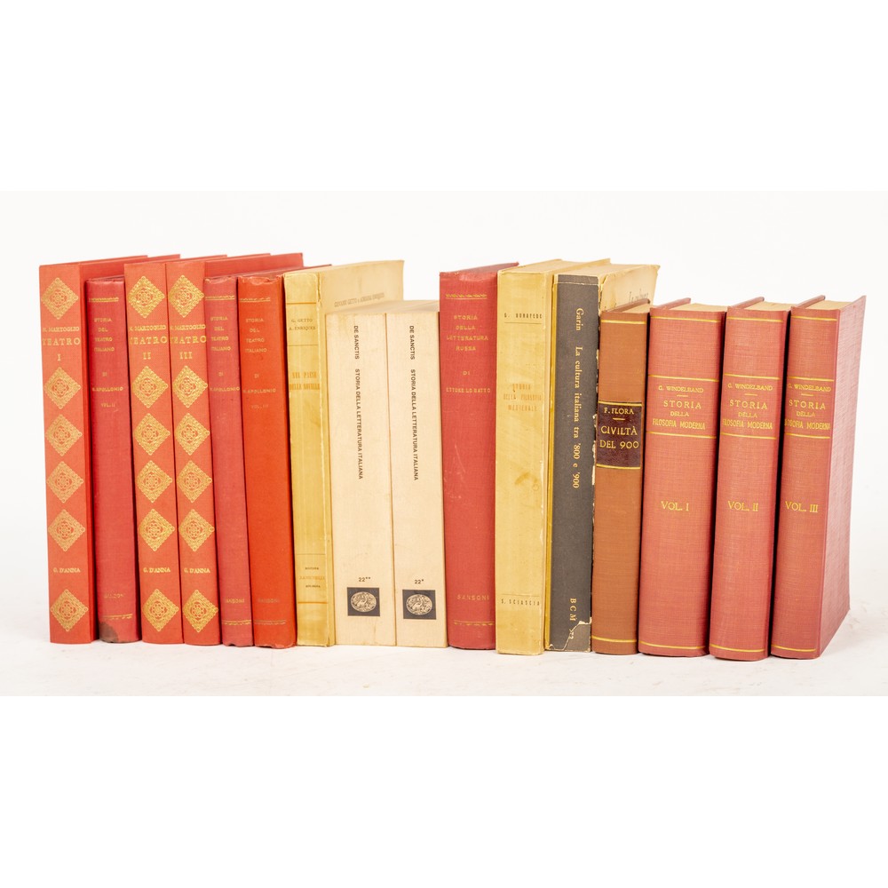 SEDICI VOLUMI IN MISCELLANEA di filosofia, teatro e letteratura, : 1) Nino Martoglio TEATRO, ed. G. D’Anna1969. In 3 volumi. Legatura editoriale in tela rigida con titoli in oro ai piatti e ai dorsi. Cm 23 x 16. Pp. 315; 332; 285. 2) Mario Apollonio STORIA DEL TEATRO, ed. Firenze, Sansoni 1938 - 1956. In 3 volumi. Cm 22 x 16. Legatura editoriale rigida con titoli al dorso. Pp. 299; 398; 457. 3) Giulio Bonafede STORIA DELLA FILOSOFIA MEDIEVALE, ed. Salvatore Sciascia 1957. Brossura editoriale cartonata marginosa. Volume ancora intonso. Cm 22 x 15. Pp. 416. 4) G. Windelband STORIA DELLA FILOSOFIA MODERNA, ed. Vallecchi 1942. In 3 volumi. Rilegature rigide telate con titoli in oro ai dorsi. Cm 20 x 14. Pp. X, 391; 354; 275. 5) Ettore Lo Gatto STORIA DELLA LETTERATURA RUSSA, ed. Sansoni 1942. Legatura editoriale in tela rigida con titoli in oro al dorso. Cm 22 x 16. Pp. 569.6) Francesco De Sanctis STORIA DELLA LETTERATURA ITALIANA, ed. Einaudi 1971. In 2 volumi. Brossure editoriali. Collana Gli Struzzi n. 22* e 22**. Pp. 1126 continuative. In perfette condizioni. 7) Francesco Flora CIVILTA’ DEL ‘900, ed. Bari, Laterza 1942 – XX. Legatura editoriale in tela rigida con titoli in oro entro tassello al dorso. Cm 20 x 13. Pp. 288. 8) Eugenio Garin LA CULTURA ITALIANA TRA ‘800 E ‘900, ed. Laterza, Bari 1962. Brossura editoriale cartonata figurata. Collana Biblioteca di Cultura Moderna n. 572. Cm 22 x 14. Pp. 360. 9) Giovanni Getto / Adriana Enriques NEL PAESE DELLE NOVELLE, ed. Nicola Zanichelli 1956. Brossura editoriale cartonata figurata. Cm 22 x 15. Pp. 273.