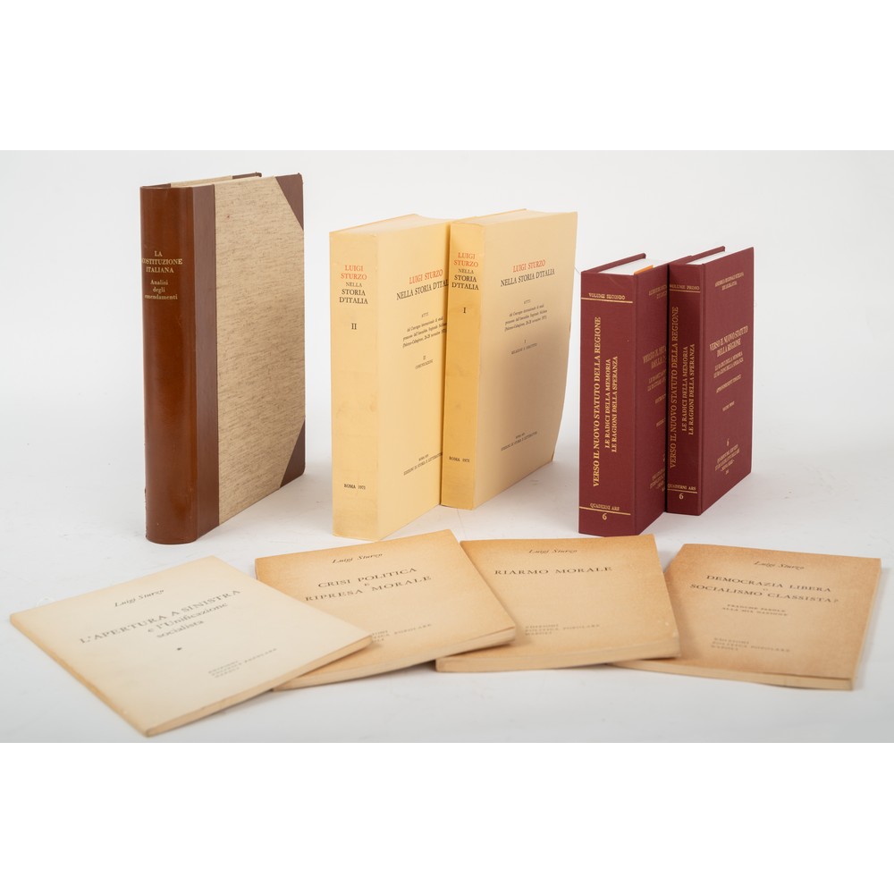 NOVE VOLUMI DI VARIA SU POLITICA E COSTITUZIONALISMO: 1) AA. VV. VERSO IL NUOVO STATUTO DELLA REGIONE. LE RADICI DELLA MEMORIA, LE RADICI DELLA SPERANZA, ed. Quaderni del Servizio Studi Legislativo dell’ARS, Collana Quaderni ARS, in 2 volumi (vol. 1 e 2). Cm 22 x 15. Legature editoriali in tela rigida con titoli in oro ai piatti e ai dorsi. In perfette condizioni. Pp. 486; 842.2) Angelo Cerizza – a cura di - LA COSTITUZIONE ITALIANA, ed. IBM 1979. Prefazione di Giovanni Spadolini, introduzione di Francesco Onida e Andrea Orsi Battaglini. Volume in perfetto stato di conservazione. Con alcuni documenti e fac simili f.t. Legatura editoriale in mezza pelle con angoli e piatti rigidi in tela grezza. Titoli in oro al dorso. Pp. XVII, 390 con 9 tavole in b/n furoi testo. 3) AA. VV. LUIGI STURZO NELLA STORIA D’ITALIA, Roma, Edizioni di Storia e Letteratura 1973. Atti del convegno internazionale di studi promosso dell’Assemblea Regionale Siciliana (Palermo – Caltagirone 26 – 28 Novembre 1971). Vol. 1 RELAZIONI E DIBATTITO, vol. 2 COMUNICAZIONI. I volumi in brossura editoriale sono contenuti in custodia editoriale in cartone muto. I volumi sono in perfetto stato di conservazione e intonsi. Pp. 531; 759. 4) Luigi Sturzo RIARMO MORALE 1957, pp. 158 (6); CRISI POLITICA E RIPRESA MORALE 1957, pp. 90 (4); DEMOCRAZIA LIBERA O SOCIALISMO CLASSISTA? 1957, pp. 88, (4); L’APERTURA A SINISTRA E L’UNIFICAZIONE SOCIALISTA, 1956, pp. 70. I quattro volumetti della Edizioni Politica Popolare sono tutti in brossura editoriale ed in perfette condizioni.