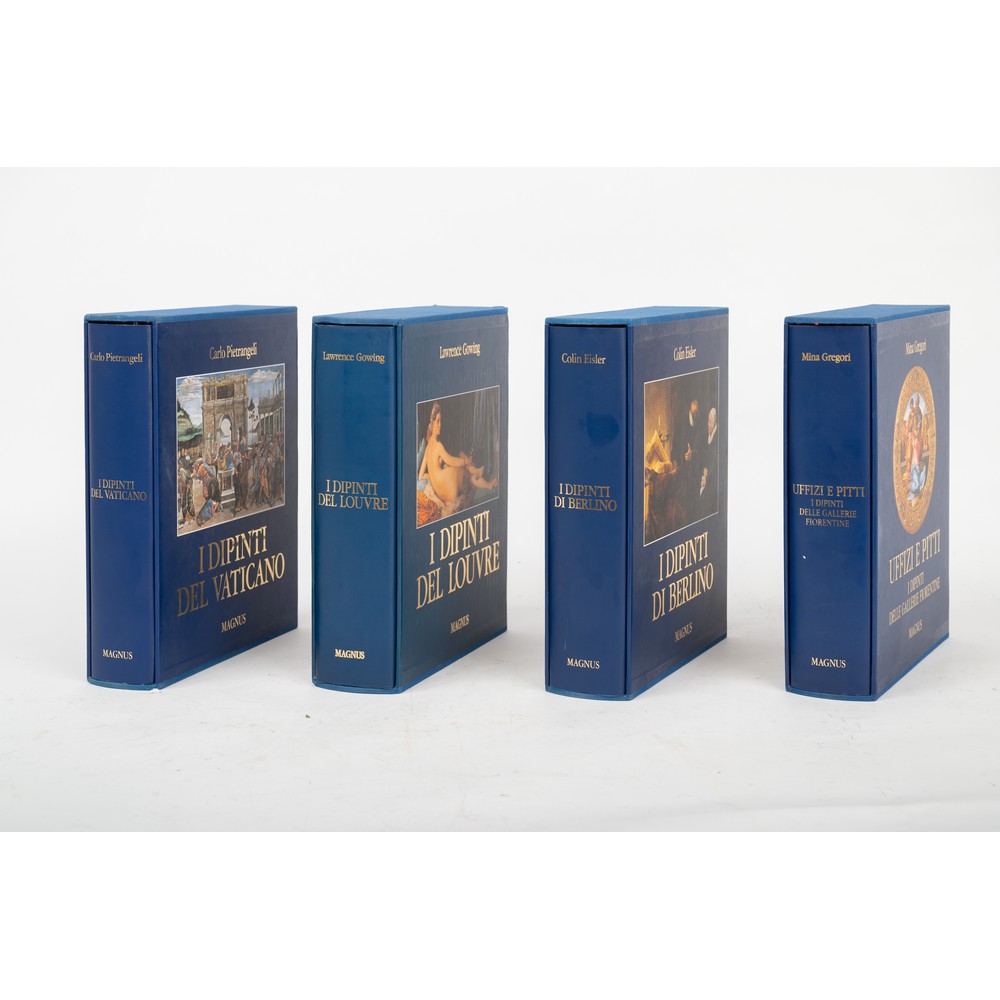 QUATTRO VOLUMI D’ARTE DELLA EDITRICE MAGNUS: 1) Lawrence Gowing I DIPINTI DEL LOUVRE, ed. Magnus, Udine 1994. Cm 30 x 24,5. Introduzione di Michel Laclotte. Elegante legatura editoriale in piena tela con titoli impressi in oro al piatto e al dorso, sovraccoperta editoriale illustrata. Volume contenuto in cofanetto editoriale cartonato illustrato a specchio. Condizioni di conservazione perfette. Il catalogo risulta minuziosamente elaborato e molto ampio. Pp. 686 con numerosissime illustrazioni a colori.2) Carlo Pietrangeli, I DIPINTI DEL VATICANO, ed. Magnus, Udine 1996. Testi di Guido Cornini, Anna Maria de Strobel, Maria Serlupi Crescenzi e altri. Cm 30 x 24,5. Elegante legatura editoriale in piena tela con titoli impressi in oro al piatto e al dorso, sovraccoperta editoriale illustrata. Volume contenuto in cofanetto editoriale cartonato illustrato a specchio. Condizioni di conservazione perfette. Il catalogo risulta minuziosamente elaborato e molto ampio. Pp. 606 con numerosissime illustrazioni a colori. 3) Mina Gregori UFFIZI E PITTI I DIPINTI DELLE GALLERIE FIORENTINE, ed. Magnus, Udine 1996. Introduzioni di Antonio Paolucci e Marco Chiarini. Cm 30 x 24,5. Elegante legatura editoriale in piena tela con titoli impressi in oro al piatto e al dorso, sovraccoperta editoriale illustrata. Volume contenuto in cofanetto editoriale cartonato illustrato a specchio. Condizioni di conservazione perfette. Il catalogo risulta minuziosamente elaborato e molto ampio. Pp. 688 con numerosissime illustrazioni a colori.4) Colin Eisler I DIPINTI DI BERLINO, ed. Magnus, Udine, 1997. Cm. 30 x 24,5. Elegante legatura editoriale in piena tela con titoli impressi in oro al piatto e al dorso, sovraccoperta editoriale illustrata. Volume contenuto in cofanetto editoriale cartonato illustrato a specchio. Condizioni di conservazione perfette. Il catalogo risulta minuziosamente elaborato e molto ampio. Pp. 655 con numerosissime illustrazioni a colori.