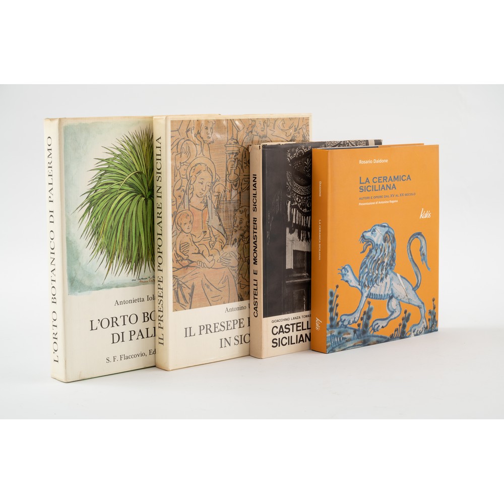 QUATTRO VOLUMI D’ARTE SULLA SICILIA: 1) Antonietta Iolanda Lima L’ORTO BOTANICO DI PALERMO, ed. S. f. Flaccovio 1978.In 4°. Legatura editoriale con sovraccoperta illustrata, e acetato protettivo. Prima edizione. Con 143 illustrazioni in b/n e a colori nel testo, varie tavole ripiegate f.t. In allegato una grande tavola ripiegata con la planimetria dell'Orto. Bibliografia. Qualche sporcizia di esposizione ma in ottimo stato di conservazione. Pp. ( 8 ) 476 ( 2 ). 2) Antonino Uccello IL PRESEPE POPOLARE IN SICILIA, ed. S. F. Flaccovio 1979. In 4°. Legatura editoriale in tela rigida con titoli in oro al piano e al dorso, sovraccoperta editoriale illustrata e acetato protettivo. Pp. 319 con numerose illustrazioni anche a piena pagina. 3) Rosario Daidone LA CERAMICA SICILIANA, ed. Kalòs 2005. Presentazione di Antonino Ragona. Legatura editoriale con sopraccoperta illustrata. Cm 22x28. Come nuovo. Pp. 316 con ill. b/n e 277 illustrazioni a colori. 4) Gioacchino Lanza Tomasi / Enzo Sellerio CASTELLI E MONASTERI SICILIANI, ed. Palermo 1968. Bella legatura editoriale con sopraccoperta in carta illustrata. Leggero strappetto alla sopraccoperta. Edizione limitata di 1300 copie. Pp. 207.