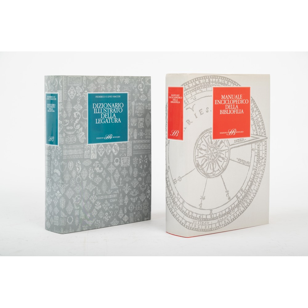 DUE VOLUMI DI BIBLIOFILIA: 1) AA. VV. MANUALE ENCICLOPEDICO DELLA BIBLIOFILIA, ed. Silvestre Bonnard 2005. In 4°. Legatura editoriale in tela con titoli dorati al dorso. Sovraccoperta illustrata. Testo stampato a due colonne su carta speciale. Nel manuale è incluso f. t. un Glossarietto dei termini più usati nei cataloghi librari francesi, inglesi e tedeschi. Chiudono il manuale le appendici relative a Dieci Anni di Antiquariato; Principali luoghi di stampa in Europa; Alcune opere di carattere generale e infine l’elenco degli Autori del Manuale. Pp. (6), 661 con centinaia di illustrazioni a colori e in b/n. nel testo e alcune a piena pagina.2) Federico e Livio Macchi DIZIONARIO ILLUSTRATO DELLA LEGATURA, ed. Silvestre Bonnard 2002. Con la collaborazione di Milena Alessi. Introduzione di Michel Wittock. Prefazione di Piccarda Quilici Alessiani. In 4°. Legatura editoriale in tela con titoli dorati al dorso. Sovraccoperta illustrata. Testo stampato su carta speciale. Pp. XXIX, 617 con centinaia di illustrazioni a colori e in b/n. nel testo e alcune a piena pagina. Come nuovo. Volume contenuto in custodia editoriale in cartone con titolo applicato al dorso.