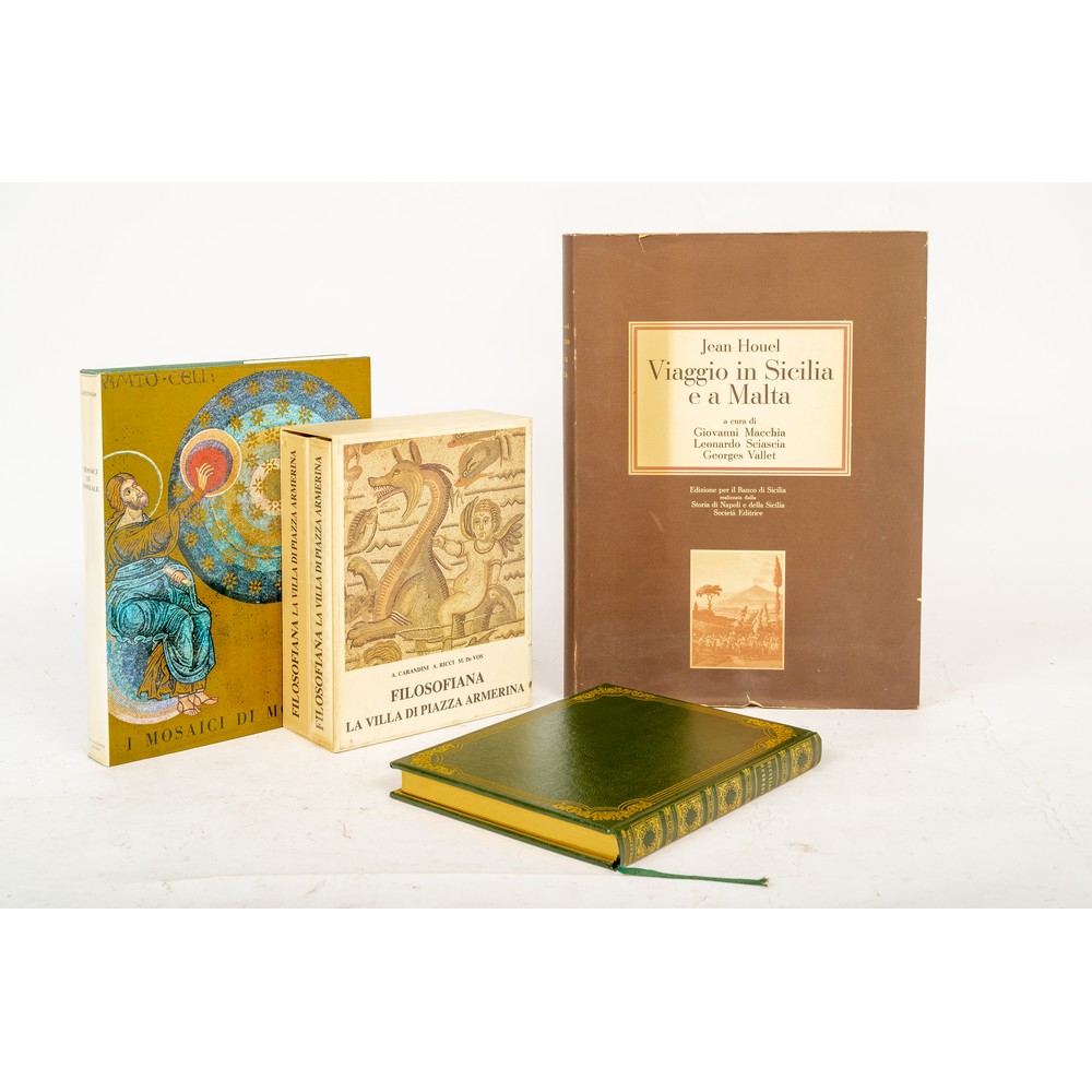 QUATTRO VOLUMI SULLA SICILIA: 1) Jean Houel VIAGGIO IN SICILIA E A MALTA, ed. Storia di Napoli e della Sicilia Società Editrice 1977. In formato atlantico. A cura di Giovanni Macchia, Leonardo Sciascia e Georges Vallet. Edizione per il Banco di Sicilia. Legatura editoriale con sovraccoperta in carta illustrata. In ottime condizioni. Pp. 367 con 108 tavole f.t. 2) Carandini / Ricci / De Vos FILOSOFIANA. LA VILLA DI PIAZZA ARMERINA, ed. Flaccovio, Palermo 1982. Opera, in cofanetto editoriale illustrato a specchio, composta da un volume + un contenitore con schede in cofanetto. Cm. 23X30. Il volume di testo è composto da pp. 414 con 232 illustrazioni in b/n e a colori nel testo e 3 tavole fuori testo. Il volume Atlante, con 65 tavole sciolte in b/n e a colori, più volte ripiegate, che illustrano l’articolazione delle strutture, dei pavimenti e delle decorazioni parietali e musive. In ottime condizioni. 3) Peter De Wint "Sicilian Scenary" The Original Sketches by Major Light. Straordinaria ristampa anastatica che riproduce fedelmente l'opera originale edita a Londra nel 1823. Legatura in similpelle verde riccamente decorata con scritte e fregi in oro al piatto e al dorso. Tagli dorati. 4 nervature grecate in oro al dorso. Volume entro custodia editoriale cartonata rigida verde. Cm 24x30. Pagine n. n., illustrato con tavole a colori fuori testo. Con allegato fascicolo di presentazione dell’opera con legatura a punto metallico di 32 pagine con traduzione italiana. Ex libris al retropiatto (riproducente quello del Rev. William Grace). Come nuovo. 4) Kitzinger Ernst I MOSAICI DI MONREALE , ed. Flaccovio 1991. Riedizione del 1991 dell’opera pubblicata nel 1960. Cm 30,5 x 28,5. Legatura in tela verde editoriale con titolo in oro impresso al dorso e al piatto, sovraccoperta policroma, illustrazioni in nero e a colori nel testo, XV pagine con elenco delle tavole e note sui restauri e con l’indice dei principali cicli di Monreale. V cartine dei rilievi architettonici, di cui tre ripiegate. Traduzione di Fanny Bonajuto. Pp. 132 con 102 tavole a colori fuori testo.