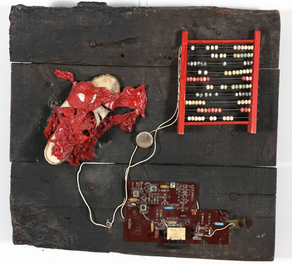 CHRISTIAN TOBAS 1944 " Objet conceptual ", 1972 Assemblaggio, abaco, scarpa, plastica e scheda computer su tavola, cm. 55 x 57 Firmato e datato sul retro Etichetta Galleria Chisel, Genova sul retro Etichetta Galleria Katia, Genova sul retro Prov. Collezione Privata