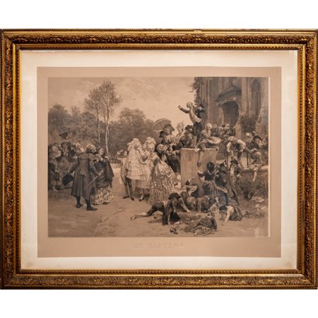 STAMPA raffigurante festa del battesimo entro cornice in legno e pastiglia.
