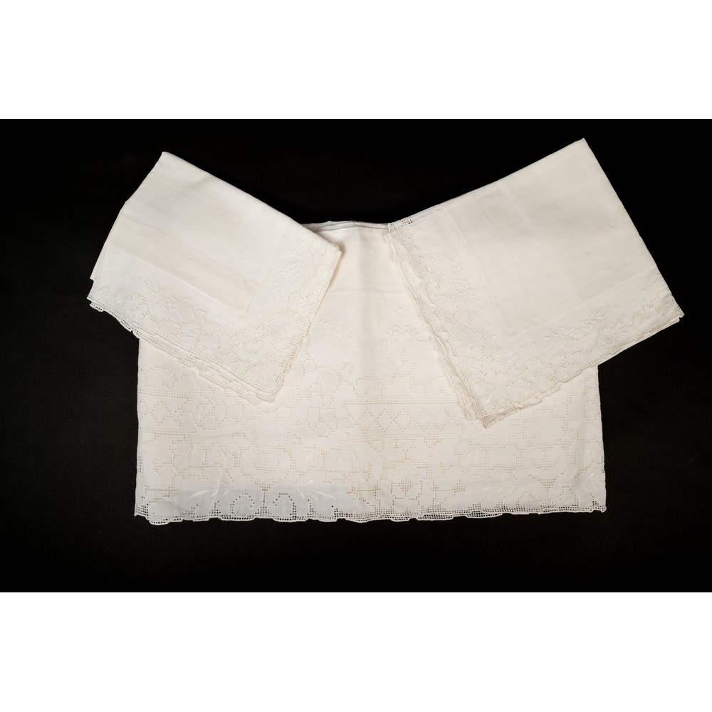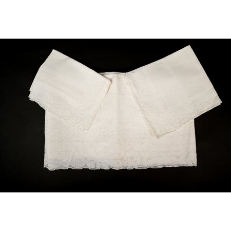 in lino, con ricamo a mano, nei toni del bianco (macchie).