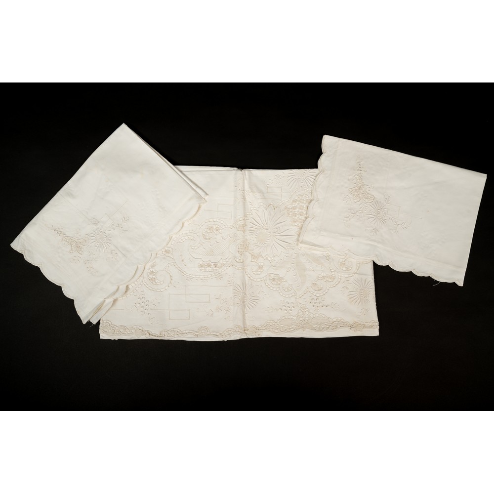 in lino, con ricamo a mano, nei toni del bianco (macchie).
