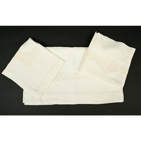 in lino, con ricamo a mano, nei toni del bianco (macchie).