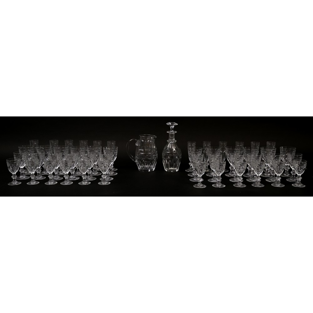 Servizio di bicchieri in cristallo composto da: 12 bicchieri per acqua, 12 bicchieri vino rosso, 12 bicchieri vino bianco, 12 flutes, bottiglia e brocca (sbeccatura in un bicchiere acqua e in un bicchiere vino).