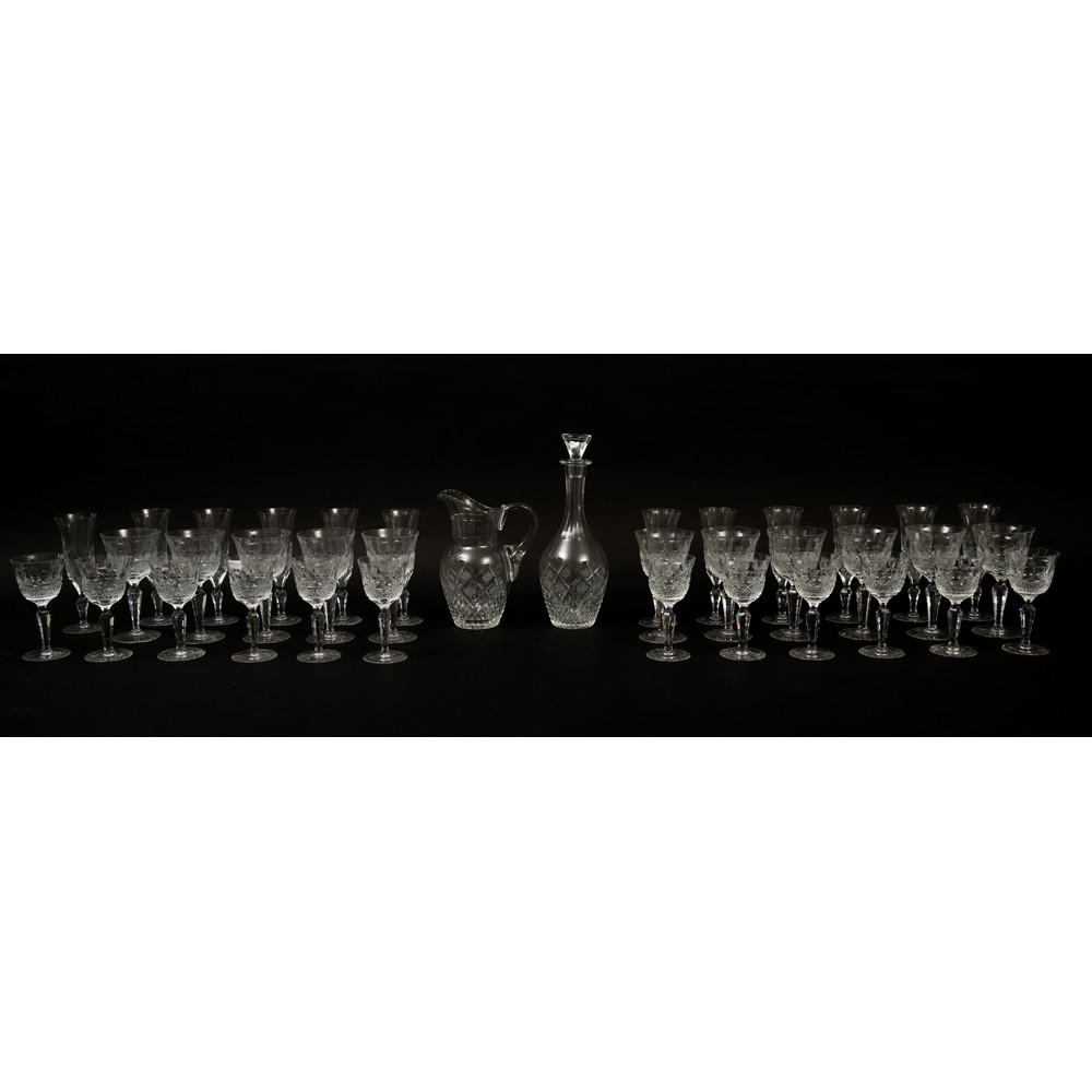 in cristallo inciso composto da: 11 bicchieri acqua, 12 bicchieri vino, 11 flute, brocca e bottiglia (sbeccature varie).
