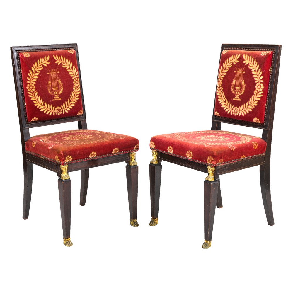 Coppia di sedie in mogano con testine e piedini in bronzo dorato.