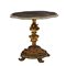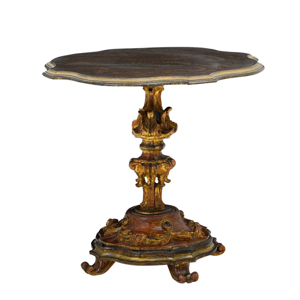 TAVOLO basso sagomato in legno di noce con lumeggiature in oro.