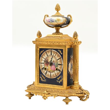 OROLOGIO stile Luigi XVI in porcellana e ottone dorato, quadrante in porcellana dipinta raffigurante scena galante.