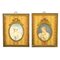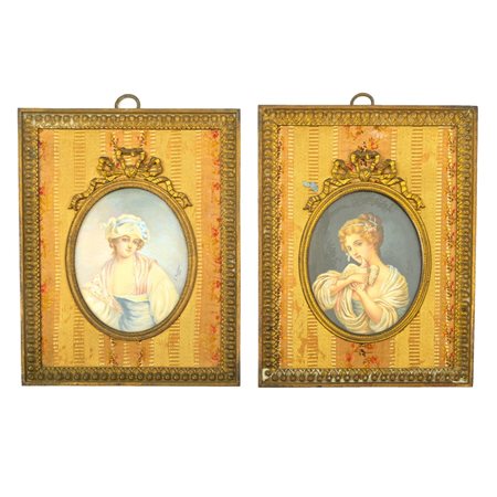Coppia di miniature di forma ovale dipinte ad olio su avoriolina firmate, cornice in bronzo dorato.