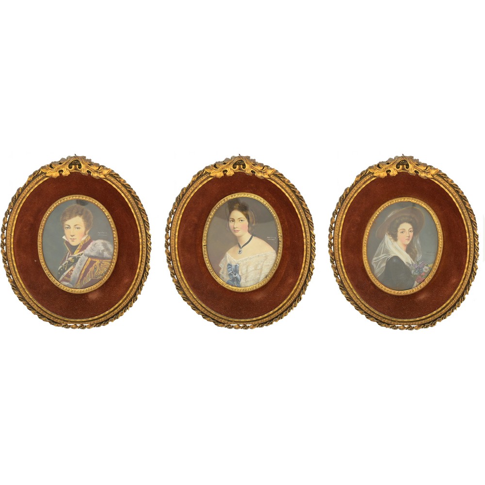TRE MINIATURE di forma ovale raffiguranti due dame e un cavaliere, cornici in ottone.