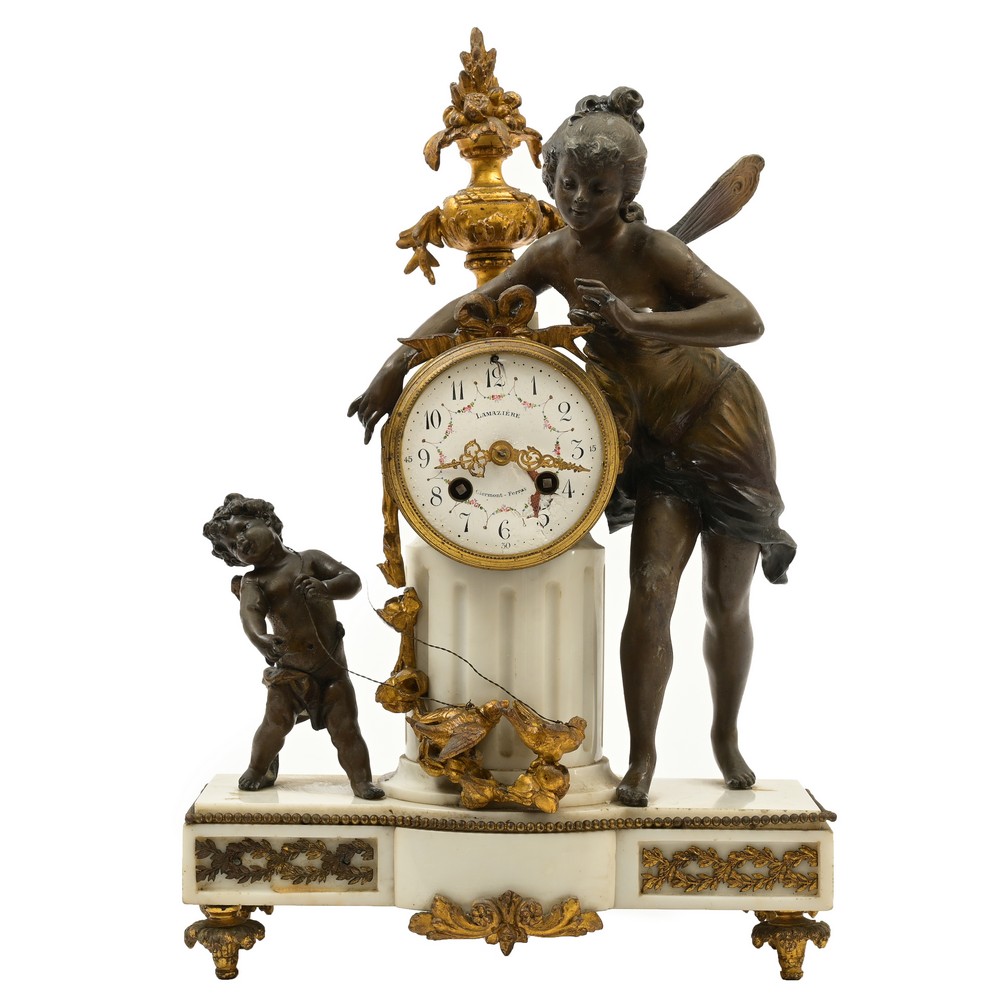 OROLOGIO stile Luigi XVI in marmo bianco con scultura in bronzo raffigurante Psiche che indica un amorino.