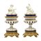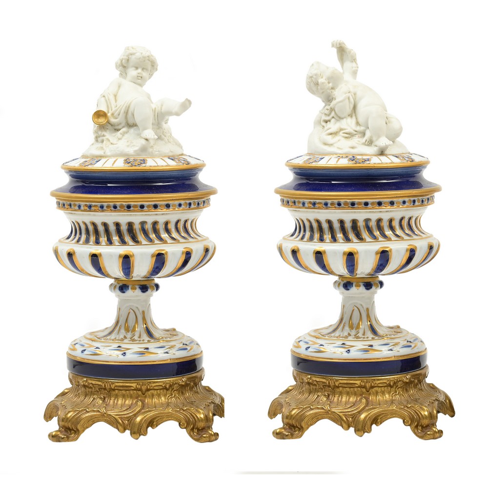 Coppia di vasi in porcellana Capodimonte policroma con coperchio sormontato da putti in biscuit, basi in bronzo dorato.