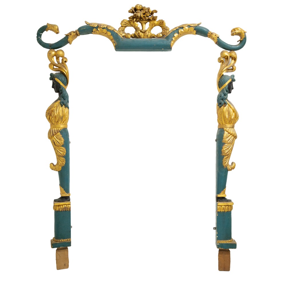 TRE ELEMENTI in legno intagliato, dorato e laccato verde, con cimasa decorata al centro da un cesto con fiori e cariatidi decorati.