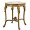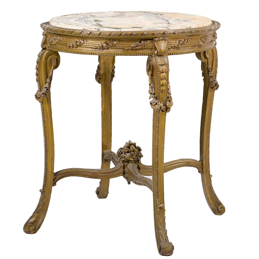 Salotto stile Luigi XVI in legno intagliato, laccato e dorato con schienali e sedute imbottiti composto da divano, quattro sedie, due poltrone e da tavolino con piano in marmo.