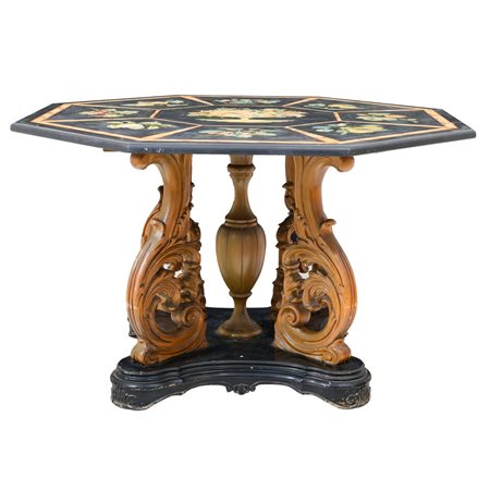 Tavolo con base in legno scolpito a girali fitoformi e piano in marmo nero con disegni in scagliola a motivo di fiori e frutta.